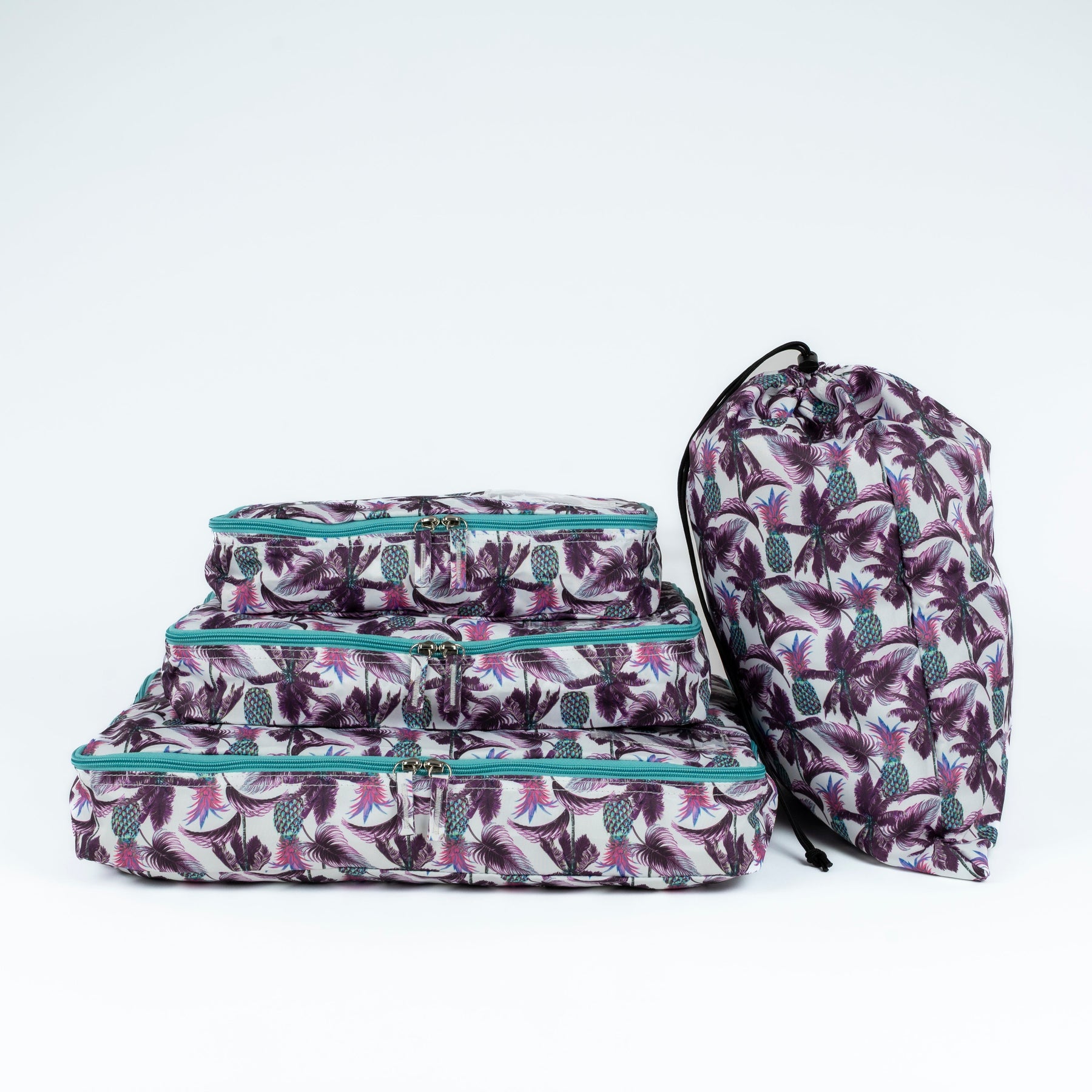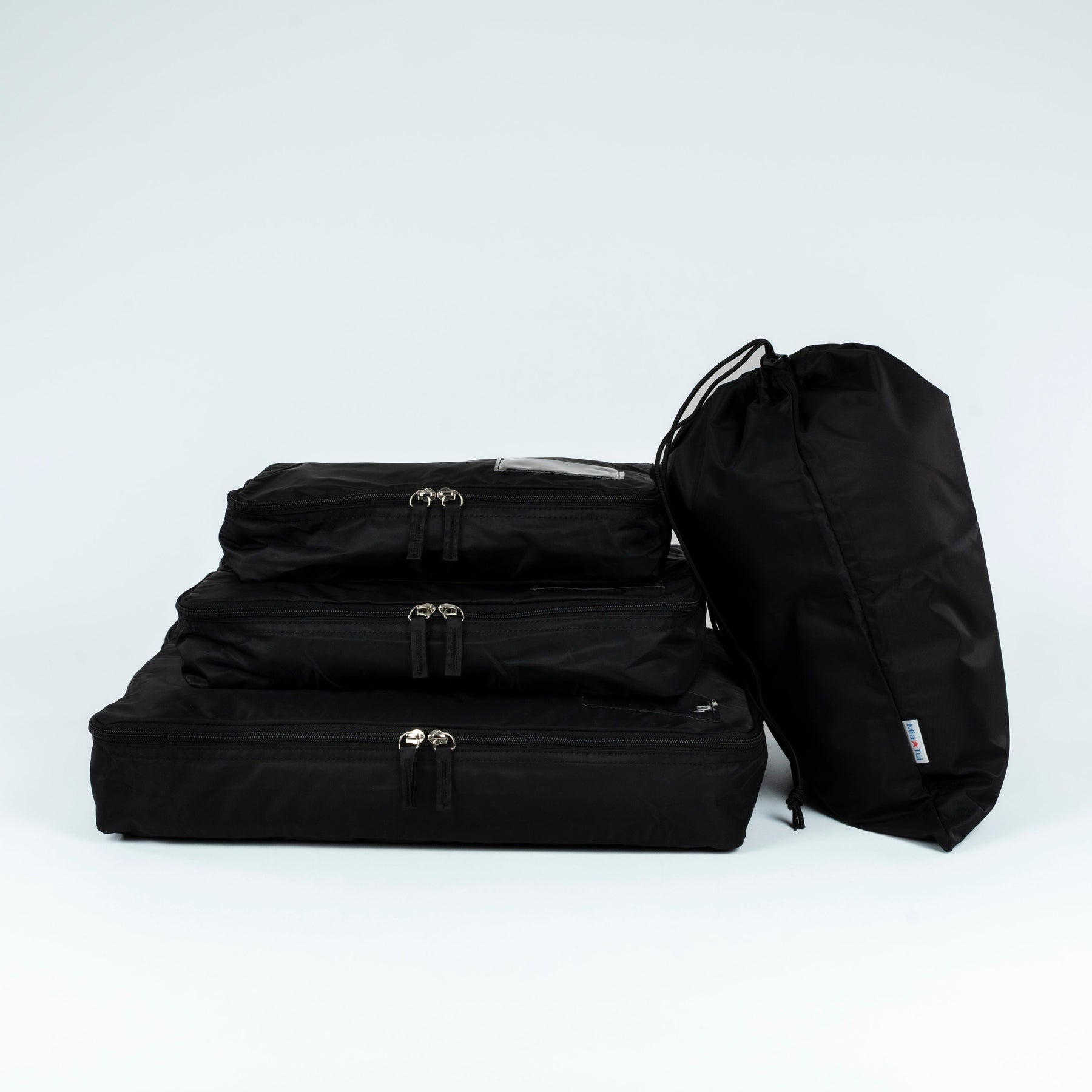 A suitcase-smoothing set of three packing cubes plus a drawstring laundry bag — so everything stays sorted, easy to find, and simple to unpack.
