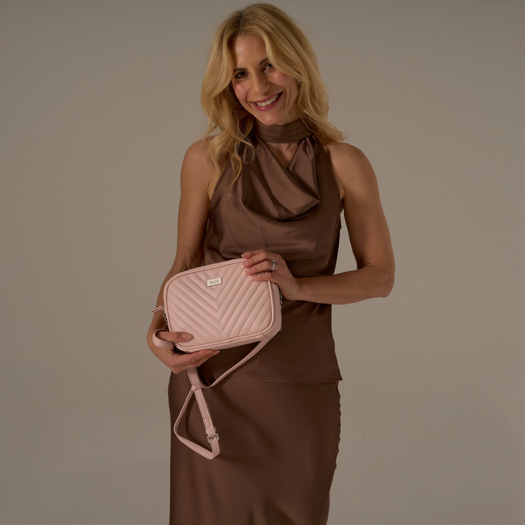 What is the strap length? The crossbody strap adjusts from approximately 120cm to 130cm for a customisable fit.